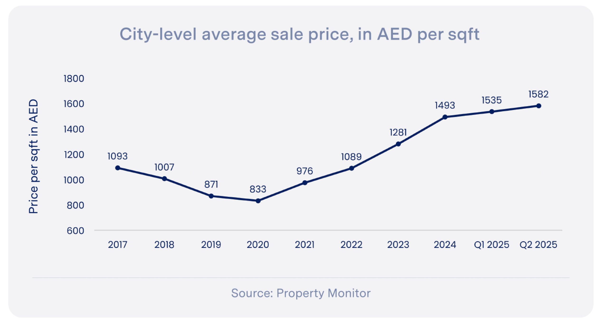 The citywide average price reached AED 1,582 per square foot in H1 2025, which is 18% higher than Q1 2024 and about 90% above pandemic-era lows, as per a Q2 2025 Dubai Residential Market Report.